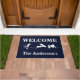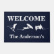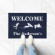 wakeboarding熱狂者のための玄関マットは、この玄関マットwakeboardersの3つの白いシルエットを特色にします。 または望むものは何でも、あなた自身の姓、句の文字を個人化して下さい。