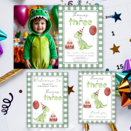 Watercolor kids birthday party. Watercolor Dino in birthday hat, cake with candles, red balloon. Green cage background.