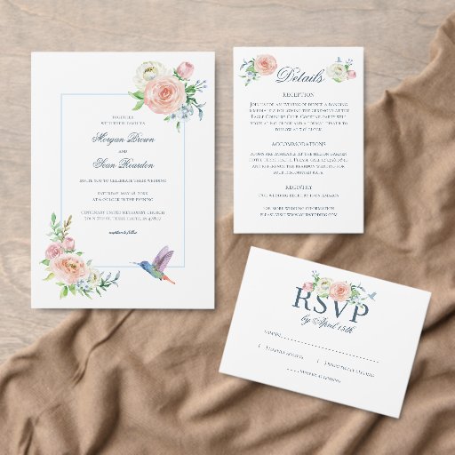 Complete your wedding stationery suite with this romantic water color floral hummingbird RSVP card, designed to perfectly coordinate with the matching invitation. Featuring soft pastel florals, elegant typography, blue seersucker striped backing and the same timeless garden-inspired style, this reply card adds a refined, cohesive touch to your wedding details. The layout is thoughtfully designed for ease and clarity, with space for guests to write their name, indicate whether they are happily attending or regretfully declining, and note the number of guests attending. Customization is simple—just enter your RSVP-by date, and the rest of the design is ready to go. Perfect for classic, garden, Southern, and romantic wedding themes, this RSVP card helps keep your planning organized while maintaining a beautiful, polished look. Pair it with the matching invitation, details card, and envelopes for a seamless wedding stationery set your guests will love