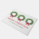 This personalized Christmas holiday doormat features green wreaths with red gingham bows. Personalize with your choice of special text and name.