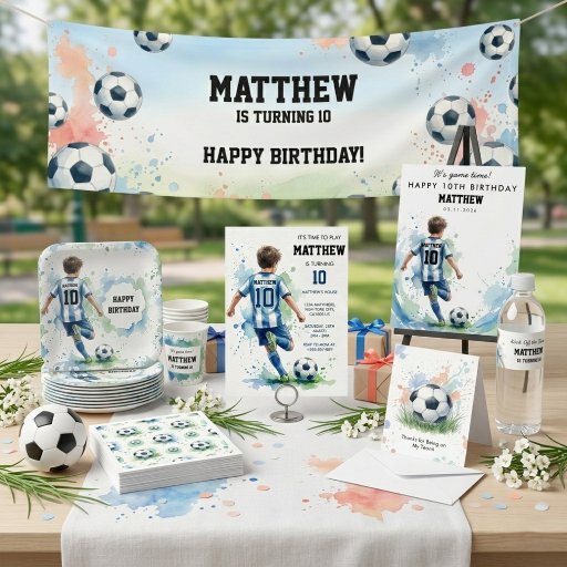 Watercolor Soccer Boy's Birthday Party サンキューカード