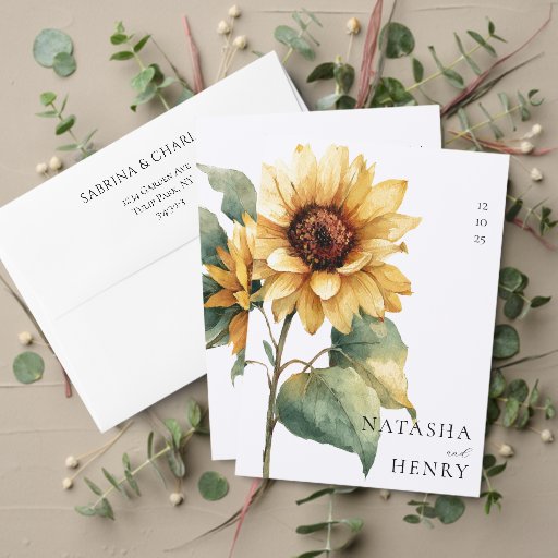 A bright yellow sunflower wedding guest book featuring watercolor floral and botanical greenery in rustic boho vintage styles.