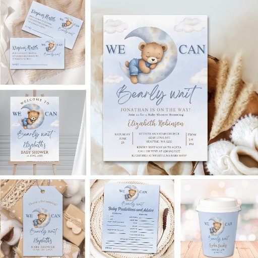 Celebrate the arrival of your baby boy with this cute bear design. Featuring a beautiful image of a cute sleeping bear on a moon and the cheerful phrase "we can bearly wait," this design is the perfect style to set a cheerful and whimsical tone for your event. For complementary products, check out the collection of this cute design for a boy baby shower.
