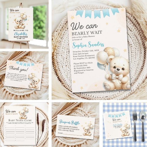 Cute design for your baby boy shower with an image of a cute watercolor teddy bear with beige and brown tones with white with the phrase "we can bearly wait" with cute modern typography in blue colors. This cute design is ideal for your baby boy shower. Don't forget to check out the collection of this cute design for complementary products.