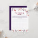Bring laughter and charm to your bridal shower with this Floral Wedding Night Game Card from the Purple Poppy & Lavender Storybook Collection. Designed with lavender and wildflower watercolor florals in a modern elegant boho style, this lighthearted activity invites guests to secretly record the bride’s reactions as she opens gifts — creating hilarious “quotes” to be read later as her wedding night comments. A fun and tasteful ice-breaker that fits perfectly with floral, garden, and romantic bridal shower themes. Coordinates with matching Guess the Age, What’s in Your Purse, and Scavenger Hunt games for a cohesive bridal game suite.