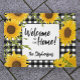 This cute and colorful floral welcome mat has yellow and orange sunflowers with a Welcome To Our Home message and a customizable name. The black and white buffalo plaid background gives a cute country farmhouse feel. Greet visitors with an outdoor mat that will enhance your yard decor.