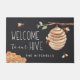 アイボリーレタリングで「私たちの巣箱へようこそ」と、ミツバチ、ハニカムと巣箱の水色イラストレーションを特徴とするかわいいミツバチをテーマにしたメッドドフォーマットでゲストを歓迎。下に沿って家族の名前でパーソナライズ。