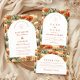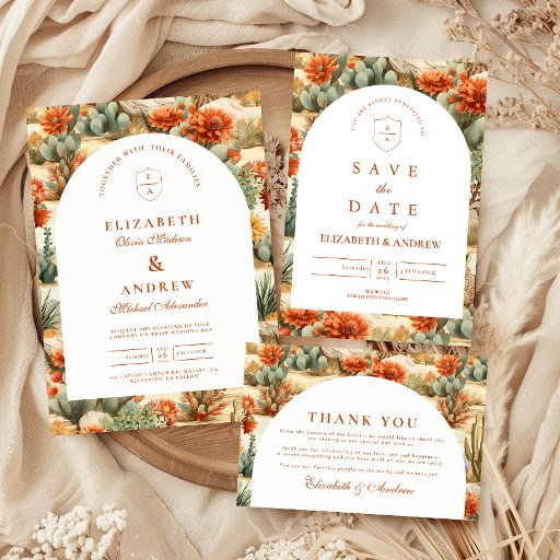 A refined western-inspired design featuring warm desert florals, cacti, and earthy botanicals arranged in a rich, painterly composition. The arched layout adds a timeless architectural feel, balancing the bold surrounding pattern with a clean, elegant center. Terracotta tones, soft neutrals, and muted greens create a grounded yet romantic palette—perfect for a modern desert or western celebration. Ideal for couples who want something unique, artistic, and effortlessly sophisticated.