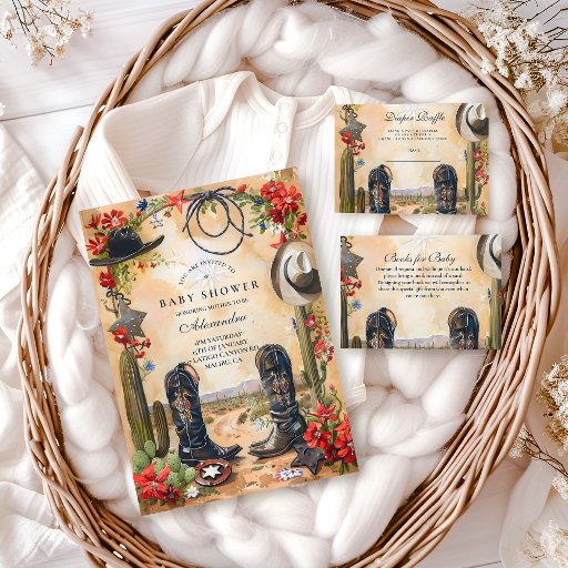 Celebrate the mom-to-be with a charming Western-themed baby shower design featuring cowboy boots, hats, cacti, and rustic desert blooms. The warm vintage tones and western flair make this design perfect for country lovers or southern-inspired celebrations. Personalize all text to fit your event details and create a unique keepsake for your guests.