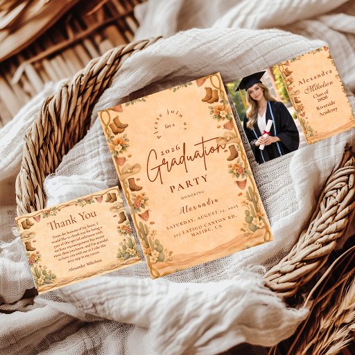 Celebrate your big milestone in style with this country western graduation party design, featuring warm terracotta tones, delicate wildflowers, and charming cowgirl details like boots and hats. The balanced floral frame and soft vintage texture create a warm, inviting look that feels both festive and effortlessly stylish.