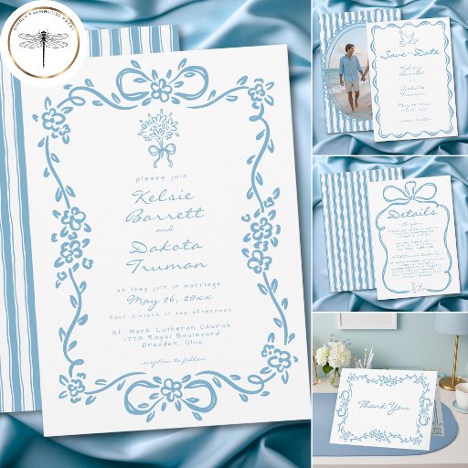 Celebrate your love with this whimsical blue handrawn and hand written wedding details enclosure card design. Featuring a delicate floral border and charming hand-drawn details, it is perfect for a romantic garden ceremony. This elegant, coquette-inspired aesthetic offers a timeless look for your unique celebration. Created by Simply Farmhouse Press.