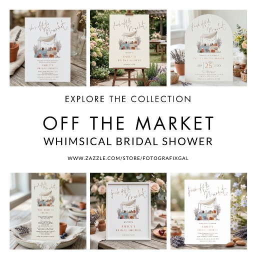 Whimsical Fresh off the Market Welcome to Bridal Shower. Available digitally and printed. ‘Fresh off the Market’ is in an elegant set script. The rest of the text you can easily personalise.