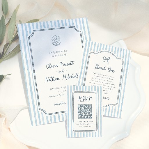 An RSVP enclosure card to match our Whimsical Retro Blue Stripes Wedding collection. This design features a navy blue hand-drawn frame against a light blue striped background. There is a QR code to RSVP online & see other details on your wedding website. The back of the design features your custom photo to perfectly match the front. View the collection linked on this page for matching items. Feel free to message me with any questions, I'll be happy to help!