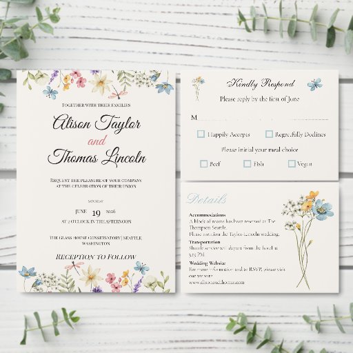 The cover features a lush 'meadow' of hand-painted watercolor wildflowers, fluttering butterflies, and graceful dragonflies against a timeless, warm cream background. The interior layout remains clean and elegant, allowing your order of service and wedding party lists to be easily read, while delicate floral accents tie the entire piece together.