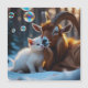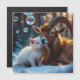 Send a heartwarming message with this enchanting postcard featuring an unlikely winter friendship! A majestic, horned goat gently nuzzles a tiny, fluffy white kitten in a serene snowy landscape, illuminated by soft light and playful, iridescent bubbles. This delightful image captures a moment of pure connection and gentle affection, perfect for animal lovers and spreading joy