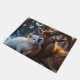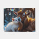 A gentle, long-horned goat shares a tender moment with a tiny white kitten in a snowy forest, surrounded by shimmering bubbles. A beautiful depiction of unexpected friendship and winter magic.