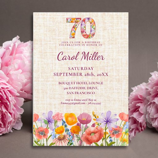 Celebrate her 70th in style with this wildflower invitation featuring a large floral-filled “70”, a soft linen-look background and watercolor garden flowers along the bottom. Personalize the name, party details and RSVP to create a beautiful keepsake for an elegant milestone birthday celebration. Enjoy!
