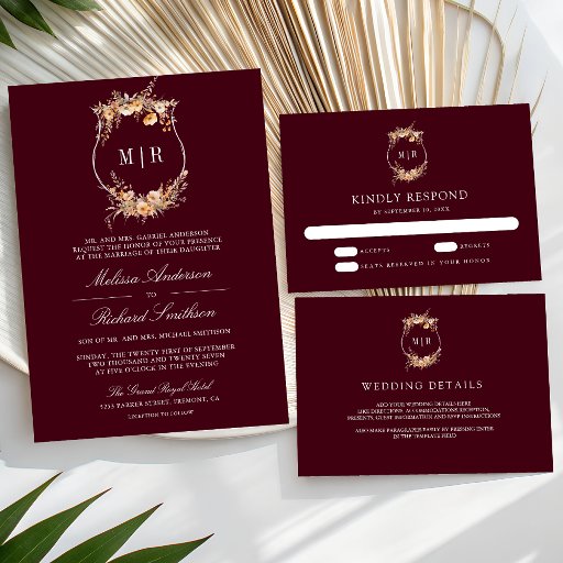 Wildflower Crest QR Code Burgundy Bridal Shower 招待状