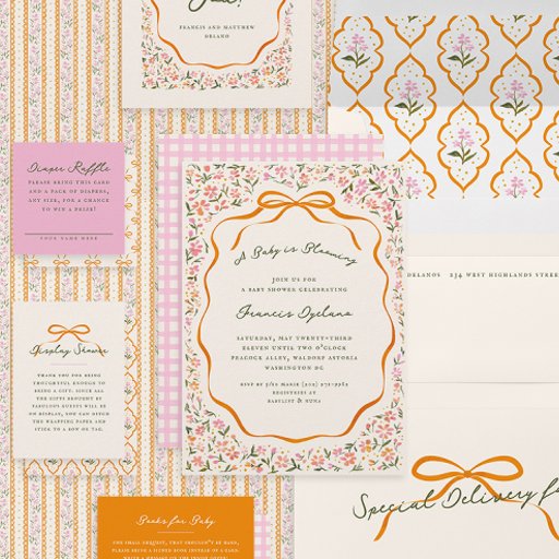 Add these custom paper napkins to a sweet Baby in Bloom shower for a charming additional detail. These napkins continue the motif of the Dainty Wildflower Baby is Blooming design with a pattern of floral filled ogee shapes to add a bit of collected eclectic charm to the event. Personalize the text with the mama to be's name.