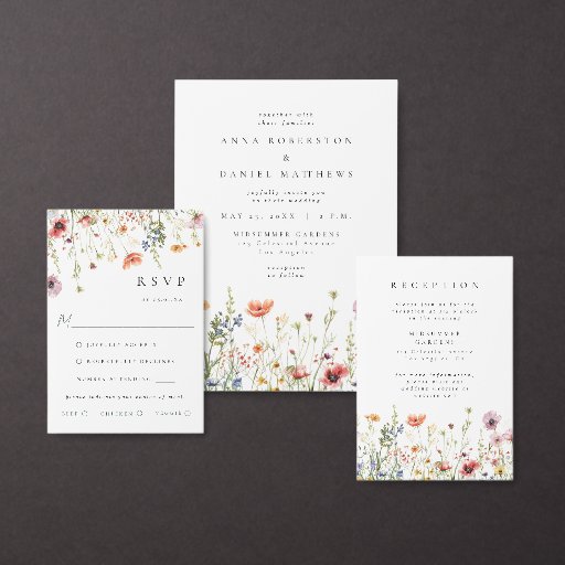 This collection features a border of elegant, rustic wildflowers in tones perfect for casual spring and summer boho-themed weddings.