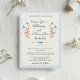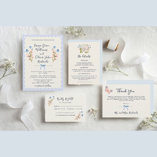 Floral Wedding invitations with beautiful romantic delicate watercolor wildflowers in blue and pink, with soft blue ribbon on a vintage cream scalloped background. Easy to personalize names, and wedding invitation wordings in a lovely script fonts. Pretty country wedding style.