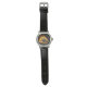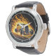 This striking watch face features a vintage-style yellow hot rod car with prominent orange and red flames painted on its side, racing along a dark, reflective road. The background is solid black, emphasizing the dynamic energy and intense fiery elements of the vehicle, creating a powerful design for automotive enthusiasts.