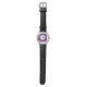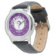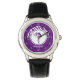 紫のワイルドゼブラ印刷の体操腕時計。体操選手のシルエットは円の中にポーズを取り、コントラストの「ポルカドット」のバナーがある。注文する前に自分の名前を追加!また、その他のオプションにカスタマイズは「it」ボタンを使用して違うフォント!©gollygirls.com
